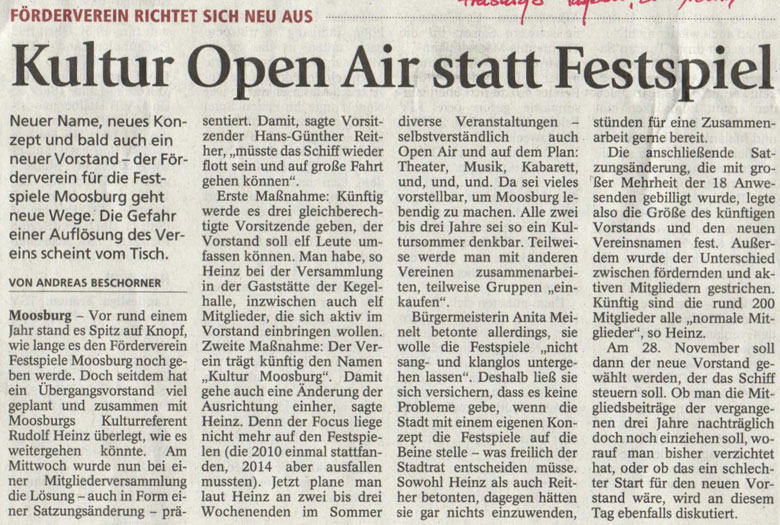 Die gestellte Alternative, den Verein entweder aufzulösen oder endlich eine tragfähige Lösung für die Zukunft zu finden, hat uns nun dazu veranlaßt, den Förderverein neu auszurichten, um auch weiterhin das kulturelle Angebot der Stadt Moosburg zu bereichern.